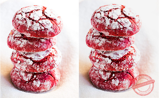 In a large bowl, beat together the butter and sugar till light. Beat in the eggs one at a time, then mix in the milk, vanilla, lemon juice and red colouring. Mix in the dry ingredients next, the flour, baking powder, soda, salt and chocolate chips. Place in the fridge for an hour to firm up. When ready, form into balls and roll into the icing sugar to coat completely. Place onto baking sheets lined with non-stick paper and flatten down slightly. Bake at 180`c for 13-14 minutes.