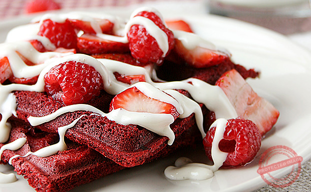 Red velvet breakfast pancakes with strawberries and Greek yogurt