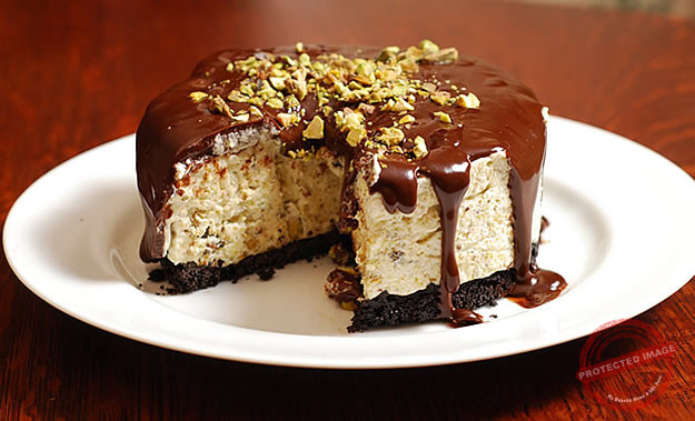 Start this recipe by making the semi-freddo at least 5 hours before you need it or the day before. Line the base and sides of a 20cm cake tin with baking paper (this will make removing the semi-freddo easy) Cut the maraschino cherries in half and place in a large bowl, reserving the juices. Add in the ricotta, nuts and the softened ice-cream and quickly mix together. Place a disc of sponge in the base of the prepared tin and soak with the cherry juices. Quickly spoon over half of the ice-cream filling and cover with the second piece of sponge. Soak with the remaining juices then spoon over the remaining filling and smooth out. Place in the freezer to firm up overnight of for at least 5 hours. 30 minutes before you are ready to serve the semi-freddo, make the ganache by melting together the chocolate and cream. Remove the semi-freddo from the freezer, peel off the baking paper and serve on a glass stand. Quickly pour over the chocolate ganache and sprinkle over the crushed pistachios. Serve immediately.