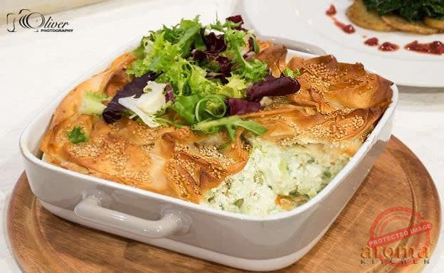 Start by heating the oven to 200`c. Brush a 26cm round flan dish lightly with a little olive oil. Layer 4 sheets of filo pastry at different angles (brushing each layer lightly with olive oil) so that the base and sides of the dish are well covered, allowing the pastry to drape over the sides. Pour the pea and ham soup along with 300ml milk into a small saucepan and heat till the soup is thick stirring constantly. Remove off the heat. In a large bowl, use a fork to slightly mash the marrow fat peas. Add in the ricotta cheese and the soup and mix together well with. Spoon the filling mixture into the prepared filo case and even out. Fold in the overhanging pastry and brush with the remaining 1 tablespoon of oil. Decoratively arrange the remaining 2 sheets of filo pastry over the top of the tart and lightly brush with any remaining oil. Sprinkle over the sesame seeds and bake the tart in the oven at 200`c for approximately 30 minutes until the filling is set and the pastry is golden. Remove from the oven and allow to rest for 15 minutes before carefully removing from the tin and serving.