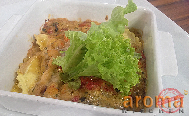 Preheat the oven to 180`c. In a pan, drizzle some olive oil and cook shellfish until ready, remove and peel. using the same pan add the finely chopped onion, fish stock, and basil. Add corn flour to thicken the sauce, not too thick and add the shellfish meat and a touch of cream. Put the ricotta ravioli in a baking dish with a splash of water and cover with the marinara thick sauce for 20 minutes.