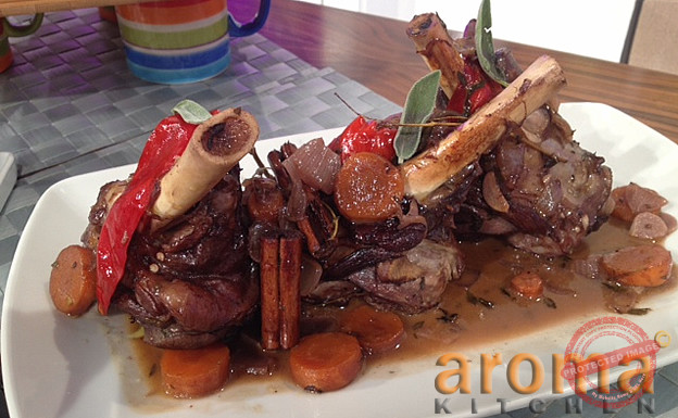 Drizzle the lamb shanks with olive season well and place in a baking tray. Roughly chop the onions, carrots, celery, tomatoes and garlic. Place around the shank and add the stock. Cover with foil and place in a pre heated oven set to 150`c and cook for 1 hour. Clean the celeriac and pumpkin and cut to your liking. Toss in olive oil, season and bake for 20minutes. Serve the lamb with its own gravy.