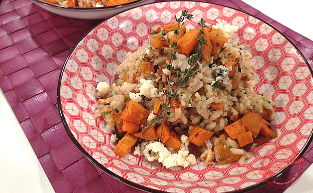 Start this recipe by tossing the diced sweet potato in a baking tray with 1 tbsp oil and season well with salt and pepper. Bake in the oven for 15-20 minutes or cooked through. In a large pan, heat the remaining oil and butter and sauté the onion and garlic for 4 minutes to soften. Add the rice and stir to coat the grains with the butter substitute. Splash in the wine and evaporate. Season with salt and pepper then add in the hot stock, a little at a time. Continue to add the stock mixture, a ladle at a time, stirring every few minutes. Each time, cook until the mixture seems a little dry before adding more of the stock mixture. Continue until the rice is almost cooked through for about 20 minutes. When done, the risotto should be thick and creamy in consistency. Add in the chopped parsley, 2 tbsp of the walnuts, crumble in the blue cheese and add in the baked sweet potato. Stir through then serve the risotto into deep bowls with the remaining walnuts sprinkled on top.