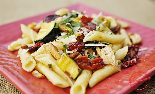 Roasted tomato and zucchini pasta with pesto and pistachios