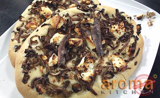 Rosemary pizza`s with caramelized onions, feta cheese and anchovies