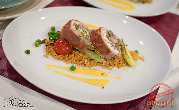 Roulade of pork fillet with caramelized apple and parsnip puree