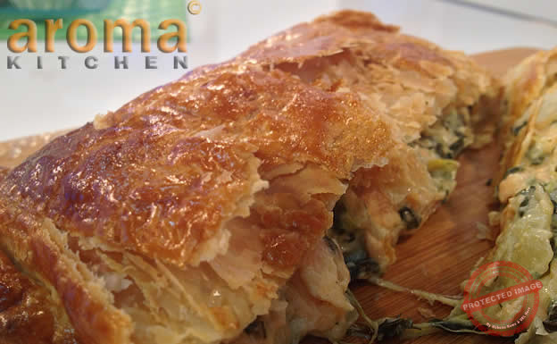 Preheat the oven to 190`c. In a large saucepan heat the flora cuisine and add the onions, saute for 4-5 minutes to soften. Add the leek and cook for 2 minutes stirring all the time. Add the flour and mustard powder and cook for 1 minute. Add the stock and allow this to reduce by half. Add the cream, reduce the heat and cook for 6-8minutes until the sauce has thickened. Season well, stir in the spinach and cook until the sauce becomes thick and creamy. Remove from the heat and cool, then stir in the lemon zest and juice and chopped dill. Cut the pastry in half and roll each half out on a floured surface to a rectangle, one approx 20cm x 32cm and 0.5cm thick and the other slightly larger and thinner. Cut the salmon into 2cm chunks season well and add to the sauce with the prawns. Mix well to coat. Lay the thicker pastry rectangle on a non stick baking sheet, then spoon the mixture down the center, piling it up high. Mix the beaten egg yolks with a little water to make an egg wash and brush the edges of the pastry with it. Place the other piece of pastry on top, trimming and crimping edges to make a ‘pillow’. Use leftover pastry to decorate the top. Brush all over with the rest of the egg wash and bake in the preheated oven for 25-30 minutes. Remove from the oven and allow to stand for a few minutes before slicing.