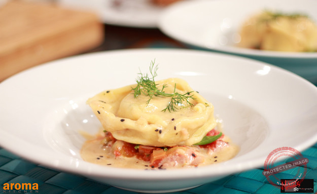 Salmon and prawn tortellacia on a leek and tomato compote, brandy cream bisque