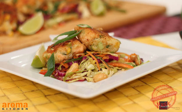Salmon and sweet corn fish cakes, Asian coleslaw with peanut dressing and sweet chilli sauce