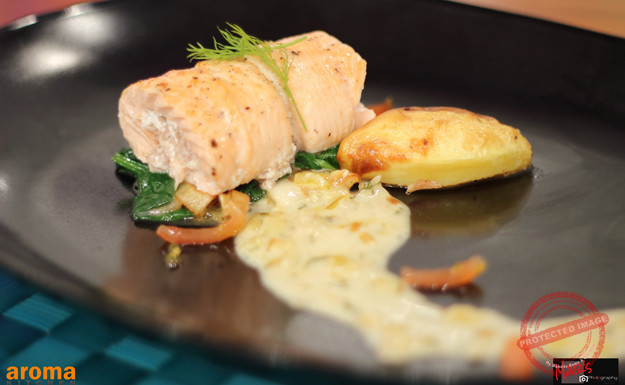 Cut the salmon slanting as possible or even lengthwise if possible, meanwhile in a bowl mix well the tuna and ricotta, season and place on the salmon fillet. Roll the salmon, place on an oven tray and grill roast until cooked through. Finely slice the fennel and sauté in butter on low heat, add a little stock season and allow to cook though. Chop the leeks, garlic and sauté in butter until butter is browned. Add the stock and simmer to reduce by half, add the cream and simmer for a few more minutes, whisk in the dill and a knob of salted butter.