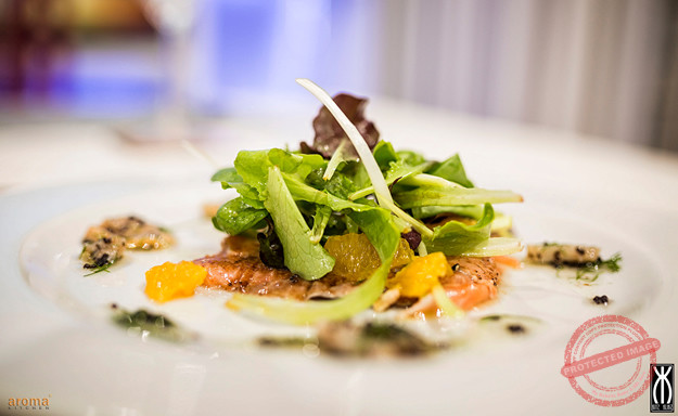 Salmon carpaccio, citrus salad with a scallop and dill dressing.