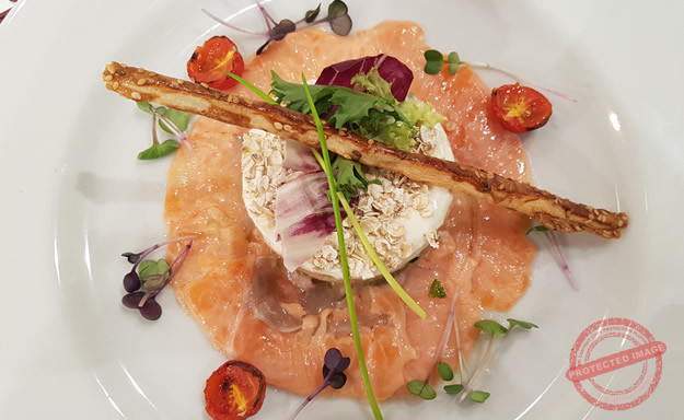 Slice ¾ of the salmon in this slices and place on a plate covered with cling film. Cut the rest of the salmon in cubes and place on another place also covered in cling film. Zest the lemon and one lime, squeeze the juice and mix with same amount of olive oil, pour on the salmon, cover with clinc film and allow for few minutes. Mix well the dip and cream cheese and leave in the fridge. Dice the avocado and squeeze the other lime in. Use 2 small round cutters to make small timbals, using a spoon place the diced salmon at the bottom, avocado next and the garlic cream cheese. Cover the top with the oasta and place in the fridge to set. Cut the cherry tomatoes in halfs and place on a tray, sprinkle with salt and roast until tomatoes are dried. Cut same shape narrow long triangles with the filo brush with melted butter and place four on each other. Place on a non slip mat and bake until golden brown. On a flat plate serve the salmon slices, sprinkle with chopped chilly and parsley. Place the timbale in the middle and remove the mould, garnish with the filo twirl roasted cherry tomatoes and pea shoot.
