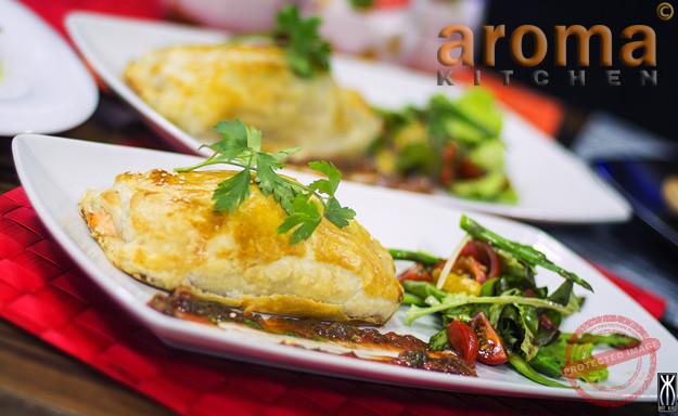 In a hot pan, seal the salmon fillets on both sides and remove off the heat. Blend the olives in a paste and carefully spread on top of the salmon fillets. Roll the salmon fillets in the puff pastry, sealing the edges well with the egg wash. Brush the top of the pastry with eggwash and bake in the oven at 200`c for approximately 20-25 minutes, or until golden brown. To make the tomato coulis, mix all the ingredients together add some crushed fresh black pepper allow to rest a few minutes in the fridge. Next, in a bowl toss together the orange segments, cherry tomatoes, leeks and blanched asparagus. Dress with the balsamic glaze and olive oil and serve with the salmon encroute and the chilled tomato coulis.
