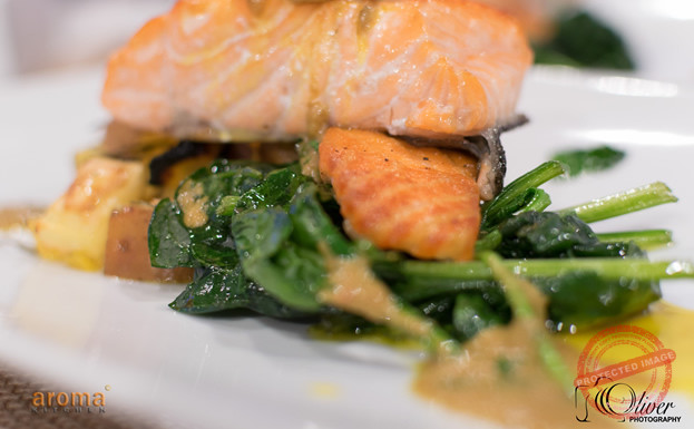 Saute the salmon from both sides and finish under the grill? Using the same pan On low heat sauté the chopped leek, garlic and curry powder until veg is softened. Mix in curry paste and than pour in the stock simmer and reduce by half, pour in milk and continue simmering until a sauce consistency. Cut the potatoes in cubes and blanch, mix with the rosemary, dice the mango and mix well together with little oil, place on an oven tray and grill until browned. Sauté the spinach in garlic oil and season
