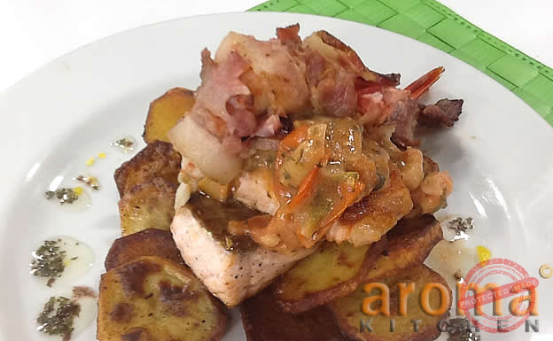 Salmon fillets with bacon king prawns