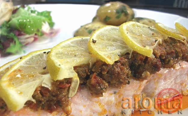 Salmon fillets with home made sun-dried tomato and walnut pesto