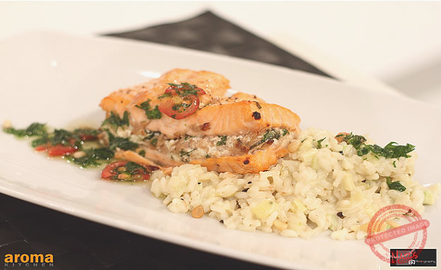 Mix well the basil, ricotta and tuna until a paste. Slice the salmon lengthwise and place the tuna mix in the middle, grill in the oven until golden brown. Chop and sauté the onion, garlic with the pepper until transparent, add the rice and keep stirring. Pour in the wine than stock, simmer until liquid is absorbed. Finally add the chopped avocado and mascarpone, stir well and serve. Chop the rocket and cut the tomatoes in segments, add 4 tbsp olive oil season and drizzle on the salmon.