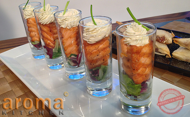 Cut the lettuce into small pcs and put at the bottom of the glass, grill the salmon from all sides and cool down. Once cooled place on the lettuce and top with pipped cream cheese, garnish with chives.