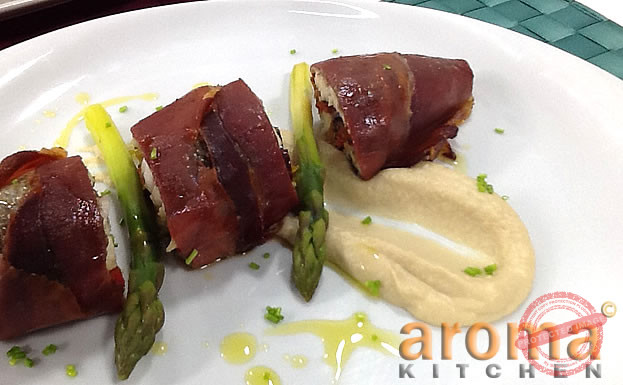 Fillet the fish and remove all bones. Finely chop the garlic, slice the onion and peppers and stir fry until cooked. Add the olives and fresh basil and at last add the flour. Arrange four slices of Parma ham, top with one fish fillet and arrange the cooked vegetable mix on top. Cover with the other fish fillet and wrap in Parma ham. Drizzle with olive oil and bake in oven for about 15/20 minutes at 180⁰c. Meanwhile, prepare the cauliflower puree. Cut the onion and cauliflower. Cook in olive oil the onion and cauliflower, then add the fish stock and cream. When all vegetables are cooked, drain from liquid and blend in a food processor with butter, salt and pepper. Set on cauliflower puree, garnish with asparagus and drizzle with lemon and basil oil.
