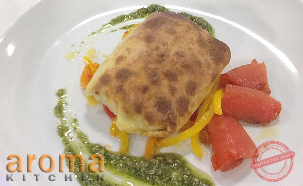 Melt the butter in a pre heated pan and cook the finely chopped onion garlic and celery for 5 minutes, then add the flour stir continuously for 2 minutes. Add the seafood and fish stock, reduce till mixture thick, add the crushed cooked potato at end. Use to fill the pancakes and bake for 2 minutes in the oven at 200`c.