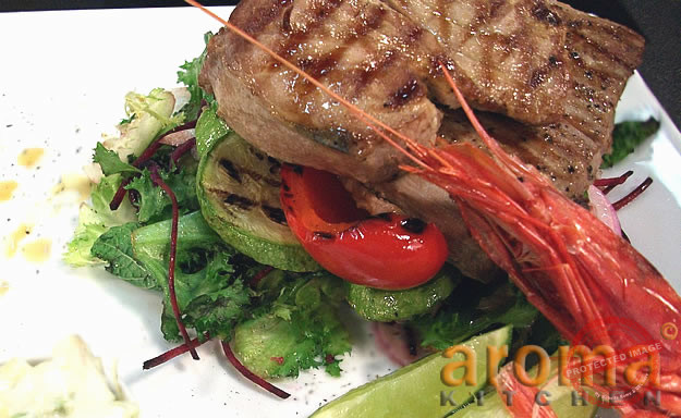 This is a very easy recipe. Start by preparing the vegetables. Slice the zucchini horizontally into thin strips and the peppers into 4 strips. Heat a tablespoon of olive in a griddle pan, and cook the vegetables on both sides for a few minutes. Put the cooked zucchini and peppers to one side. Next, season the fresh tuna steaks with lots of salt and pepper drizzle with olive oil and quickly sear the tuna in a hot griddle pan for a couple of minutes each side. Meanwhile, as the tuna is cooking, make the lime and avocado mayonnaise by mixing together the mayonnaise, lime juice and zest, and the chopped avocado. You are now ready to start serving. Place the mixed salad leaves in a bowl and drizzle with some balsamic vinegar, olive oil and fresh seasoning. Mix well, and place a handful on your 2 serving plates. Place the slices of grilled zucchini and peppers on top. Finally, place the grilled tuna steaks on top of the peppers (2 pieces per person) and drizzle with the pan juices. Serve the lime and avocado mayonnaise in a small bowl on the side of your serving plates.