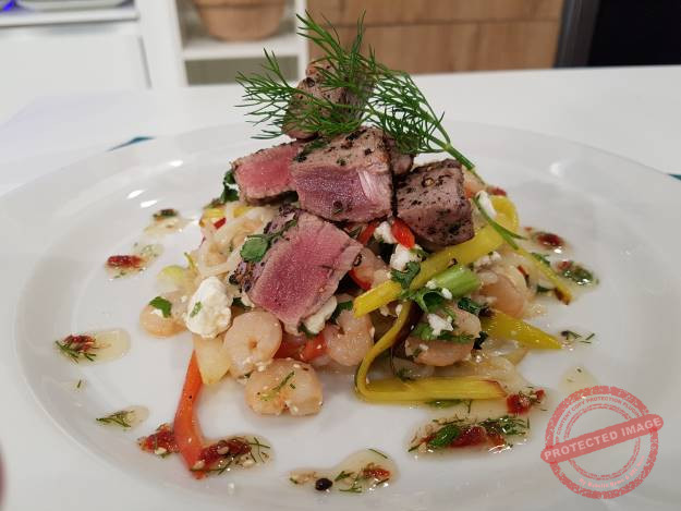 Seared peppered tuna on a prawn and leek chilli pasta salad