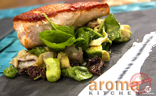 Seal the salmon from all sides and finish under the grill, slice the calamari and grill together with the salmon. Peal the beans, dice the avocado, chop the sundried tomatoes, slice the artichokes and mix all together in a bowl. Once calamari are cooked remove from tray and in a separate bowl mix with the olive oil and mint, allow to cool until salmon is cooked than mix with the avocado mix and also add the crushed walnuts and spinach leaves. Serve the salmon on the salad with natural yogurt on it.