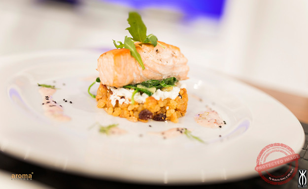 Crush the muesli and mix well with the salted butter, divide in 2 moulds and bake at 180`c for 8 minutes. Crush the feta on both bases and insert again in the oven until the cheese has melted. Seal the Salmon from both sides and finish in the oven, and a knob of butter to the same sauté pan and toss the berries for 1 minute, squeeze 1 orange bring to the boil and remove from heat. Once the berries are cool mix in the yogurt and leave to rest in the fridge. sauté the spinach with garlic in the last minute and serve on the tart with the salmon on top and drizzled with the cranberry yogurt dressing. Garnish with fancy leaves on top.