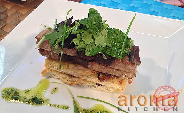 Seared tuna on an onion glazed baguette with a herb salad