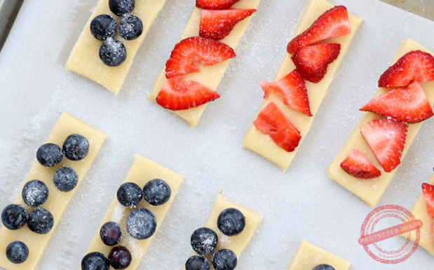 Start this recipe by making the pastry using the rubbing in method. Bind together with the egg and use to line the base of a square cake tin. Prick all over with a fork and bake for 30 minutes at 200`c till golden brown. Remove from the oven and allow to cool down completely. Next, mix together the melted chocolate and cream cheese and spread evenly over the biscuit base. Immediately arrange the fresh berries over the top and place into the fridge for the white chocolate ganache to set. When ready, remove from the tin and cut up into squares.