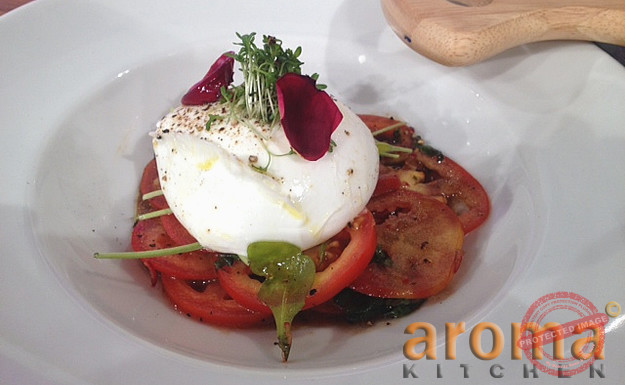 Sliced tomatoes tossed with olive oil topped with basil leaves, whole buffalo cheese and finished with rucola leaves