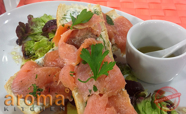 Mix together the cream cheese, lemon juice and chives in a small bowl. Meanwhile, slice the baguette in round pieces and toast from both sides .Spread the cream cheese mixture on one side of the toasted bread and serve with the smoked salmon, lettuce leaves and drizzle with some olive oil before serving.