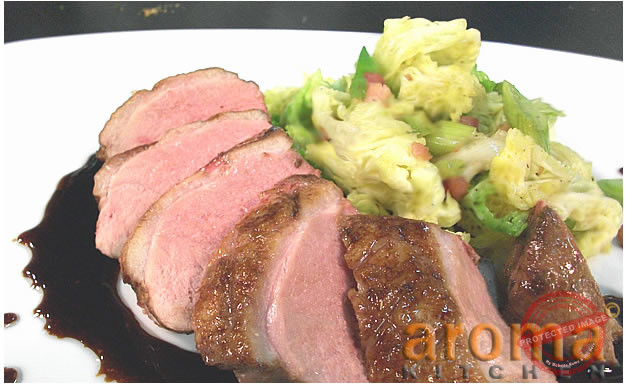 Soy sauce and honey glazed duck breast with pancetta, sesame oil and Savoy cabbage