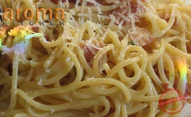Start by cooking the pasta in boiling water. Pan fry the pancetta, when cooked add the chicken stock. In a separate bowl, mix the egg yolks, sparkling water, pecorino cheese and cracked pepper. When the pasta is nearly cooked, drain it and add it to the pan with the pancetta and stock. Take off the heat, add the egg mixture, stir and serve.