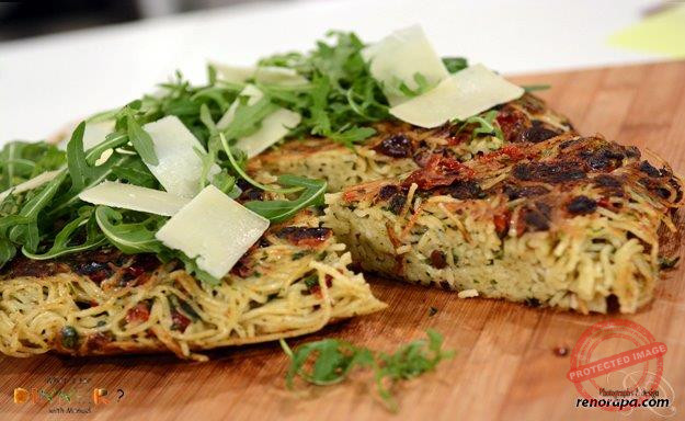 To prepare this recipe, place the ¾ cooked spaghetti into a large bowl and add in the eggs, herbs, pesto, sun-dried tomatoes and olives. Season well with pepper and mix everything together well. Heat up the olive oil in a large non-stick pan, and add the spaghetti mixture. Quickly flatten out and fry on both sides for about 5-7 minutes, or until golden brown. When cooked, transfer onto a large plate and decorate with rocket leaves and parmesan cheese shavings. Serve the frittata either hot or cold.