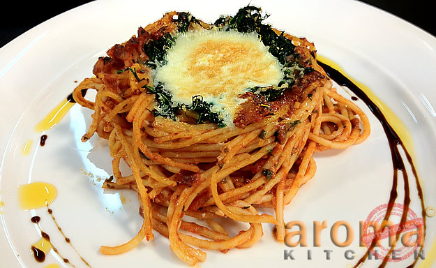 Start this recipe by making the sauce for the spaghetti. Heat the oil in a pan and quickly brown the bacon. Add in the chopped onion and garlic and continue to cook for 4-5 minutes, to soften the onion. Add in the tomato puree, polpa and season well with salt and pepper. Mix well, then turn down the heat and leave to simmer for 5 minutes. When ready, add in the chopped basil and parsley and take off the heat. In a large bowl, mix the cooked pasta together with the tomato sauce and grated Parmesan cheese. Put 1 tablespoon of the grated cheese aside to garnish later on)using a large serving spoon and a fork, Scoop up some of the spaghetti and twist around the fork, forming a spaghetti nest. Place the nest into a baking dish. Repeat the process with the remaining spaghetti. You should have enough spaghetti for 6 nests. Make a small opening in the top of each nest, and place a tablespoon of the cooked spinach into each nest. Finally, break an egg into each nest and sprinkle over the remaining grated Parmesan cheese. Bake the nests in the oven at 200`c, for about 10-15 minutes only, just enough time to cook the eggs. Take the baking dish out of the oven, and serve 2 spaghetti nests with bacon, Parmesan and spinach onto each serving plate. You can also serve a crispy salad on the side.