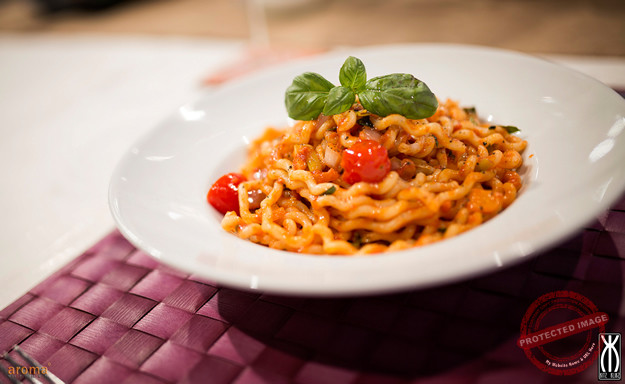 Chop the garlic, shallots, spring onion and sauté in olive oil on low heat. Allow vegetables to become transparent than add also the cherry tomatoes cut in half’s. Sauté for a few more minutes on low heat than pour in the tomato pulp, simmer for a few more minutes. Cook the spaghetti al dente and than toss in the tomato sauce, simmer for a few minutes into the sauce. If sauce is too thick add some water from the pan used to boil the pasta. Season well and add the fresh basil, drizzle with olive oil and serve.