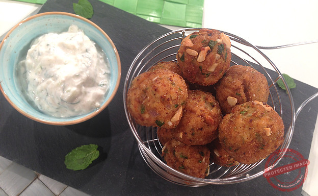To make the raitha, it is important that the grated cucumber has any water squeezed out before you mix it with the other ingredients. Place into a sieve or a clean tea towel and squeeze to remove any liquid. Mix with the other ingredients and chill. Next, make the chicken mixture by mixing all of the ingredients (except the breadcrumbs and oil) and season well with salt. Form into balls the size of a walnut, then roll into the breadcrumbs pressing together well. Heat the oil and use a slotted spoon to gently fry the balls till golden brown and crispy. Allow to drip on kitchen paper before serving the spiced chicken balls with the chilled raitha.