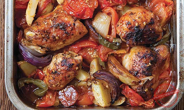 Season the chicken pieces well with salt and pepper and dust with paprika. Heat the oil and butter casserole or a large saucepan. Add the chicken and cook over medium heat, turning for 10-15 minutes or until browned all over. Transfer to a plate. Add the chorizo the onions and the peppers to the casserole. Cook over a low heat stirring occasionally for 5 minutes. Add in the wine and reduce. Add the canned tomatoes, Worchestershire sauce, Tabasco sauce. Bring to the boil. Return the chicken to the casserole, cover and simmer for 30minutes. Add the Potatoes and the herbs to the casserole, Partially recover and simmer for a further 30 minutes and serve. Garnish with some fresh oregano and Chilies.