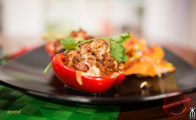 Start this recipe by frying the onion in the oil for 3 minutes before mixing in the garlic paste and Chipotle paste. Add the beef mince to the pan and brown for 2 minutes. Stir in the spices, season with salt and add the taco beans to the pan and cook for 5 minutes. Take off the heat and stir in the coriander. Next, lay the red pepper halves onto baking tray and stuff with the beef filling. Sprinkle the cheese on top and bake in the oven for 20-25 minutes. Meanwhile, lay the tortilla chips onto a baking tray and randomly spoon over the salsa, kidney beans and cheese. Bake in the oven for just 5-10 minutes until the cheese melts and starts to brown. To serve, place 2 stuffed peppers onto each serving slate with a good mound of the cheesy tortilla chips on the side.