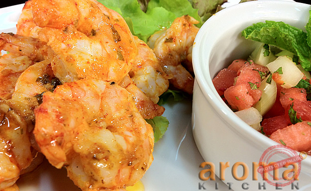 Spiced tiger prawns with melon and cucumber relish