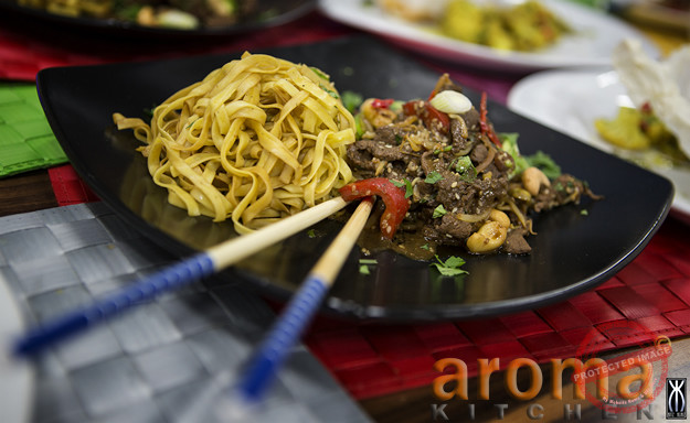 Spicy beef stir-fry with peppers and cashew nuts