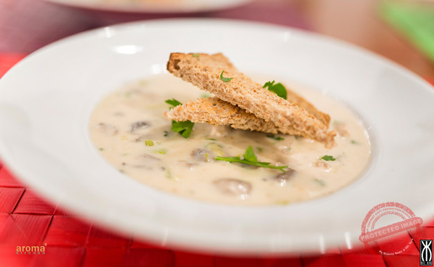 Dice the chicken, mix with the red curry and sauté in butter until browned. Dice the leeks, celery, garlic, mushrooms and sauté together with the chicken. Mix in the flour than gradually pour in the warm stock mix mixing continuously. Simmer for a few minutes than add the coconut milk and herbs.