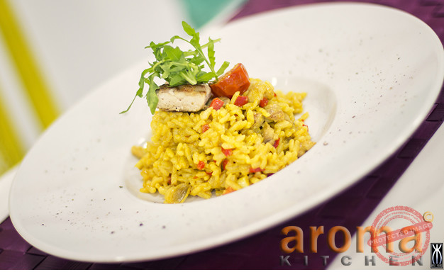 Dice the chicken, onion and garlic and sweat together with the butter and olive oil. Mix in the curry paste and cook until softened. Add the rice and stir for 2 minutes before gradually adding in the saffron broth. Simmer, stirring continuosly and when almost cooked add the diced peppers and coconut milk. Stir on low heat until the liquid is absorbed and remove off the heat. Serve with knob of marcarpone cheese on top.