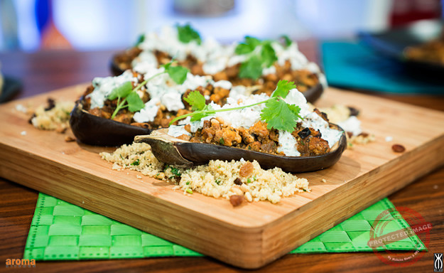 Spicy chicken stuffed aubergines with lemon, coriander and toasted pine nut couscous