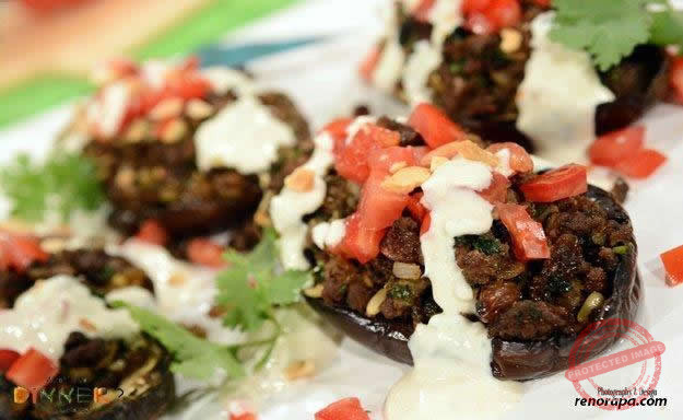 Spicy lamb stuffed aubergines with sultanas and pine nuts and tahini dressing