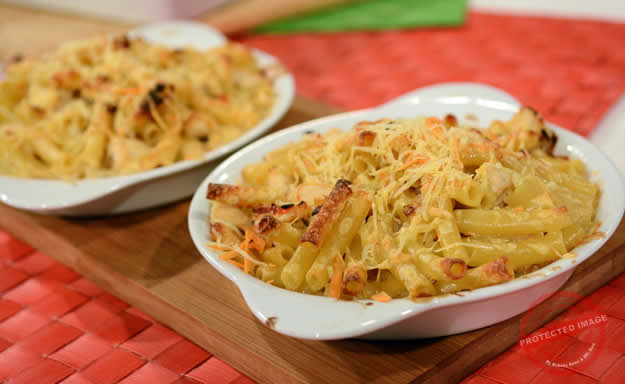 Start this recipe by half cooking the pasta in a pan of salted boiling water. Meanwhile, place the cream into a saucepan and grate in the red hot Dutch cheese. Mix together and heat until the cheese has melted. Stir in the chopped parsley and put aside. Next, heat the oil in a large pan and sauté together the garlic, onion and chilli for a few minutes. Add in the diced chicken and cook for a few minutes to brown. Next, pour in the prepared cheese sauce mix together well. Pour the mixture into a buttered oven dish and grate over a little more red hot Dutch cheese. Place into the oven for 25-30 minutes until golden brown and bubbling.