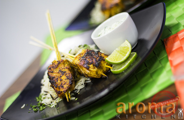 Place all the marinate ingredients in a bowl and season well with salt. Mix well and put aside while you prepare the salmon. Cut each salmon fillet into 2 large cubes, trimming off a little of the thinner ends. Place into the marinade and leave for 4-5 hours or overnight. When you are ready to cook, thread each salmon piece onto 2 wooden skewers. This makes them easier to pick up. Heat a griddle pan with a little oil and cook the salmon quickly on both sides for 3-4 minutes. Serve the salmon immediately with cooked wild and basmati rice and yogurt and cucumber raita.