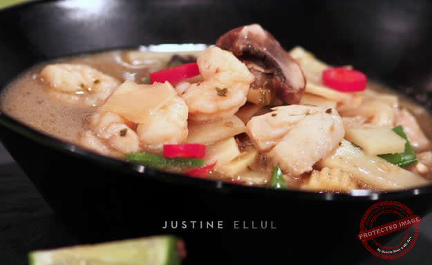 Heat the oil in a deep pan and quickly fry the garlic and ginger for a minute. Add in the Thai curry paste and cook for a minute. Stir in the coconut milk, fish stock, soy sauce and fish sauce and cook for 10 minutes. Next, add in the fish pieces and prawns, shitake mushrooms, sweet corn and mange tout and cook for another 2 minutes. In another pan, quickly cook the noodles in hot water and add to the cooked soup along with the bamboo shoots and chopped coriander and serve immediately into deep soup bowls.