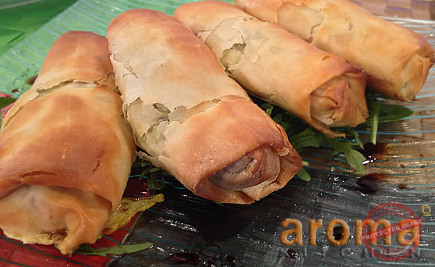 Crumble the feta cheese over the spinach and mix in an egg, chopped herbs and season. Work with 2 filo pastry sheets at a time, keeping the rest covered with a tea towel to prevent them from drying out. Brush a sheet of filo pastry with melted butter then press the second sheet on top. Brush again with melted butter. Cut in half to 2 even rectangles. Spread the filling on one end of the filo rectangle. Roll the pastry over the filling to enclose it. Tuck in both ends and roll. Brush with melted butter and bake.